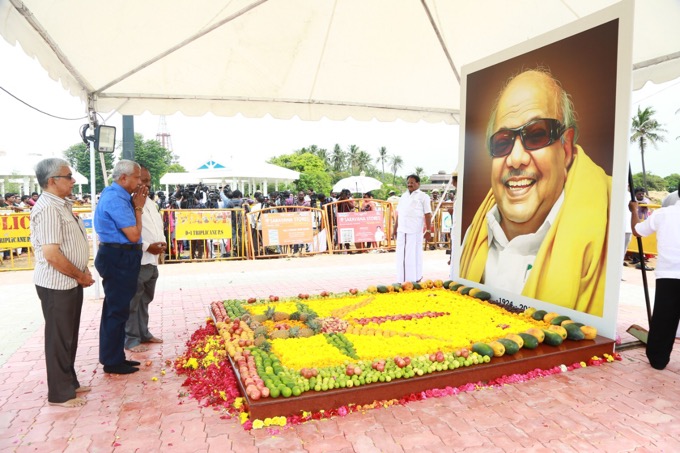 ஆகஸ்ட் 7 ஆம் தேதி மாலை 6.10 மணிக்கு மறைந்த திமுக தலைவர் கலைஞர் மு.கருணாநிதியின் உடல் ஆகஸ்ட் 8 ஆம் தேதி இரவு 7 மணியளவில் நல்லடக்கம் செய்யப்பட்டது.